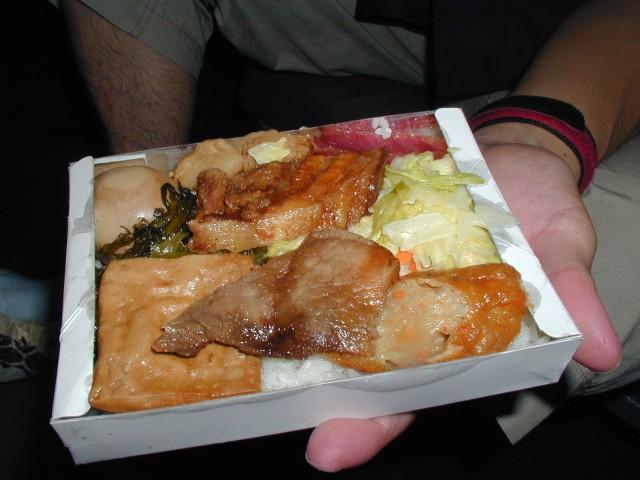 ▲福隆車站月台的50元便當,看看如此菜色,讓剛從古道下來飢腸轆轆的我們展開狼吞虎嚥的功夫