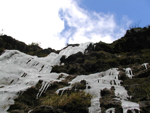 離開利稻,由於時間緊迫,因此便開始趕往晚上住的地方「梅山」,一路上雲海景觀不斷的出現,實在是非常引人入勝,中途還遇到一處結冰的山壁,可見得那裡到晚上都一定是零下的低溫,真是冷斃了。大關山隧道口前,標高2722公尺,氣溫大概五度左右吧?就看到Patti一個人穿著短袖在那跑來跑去, 一點都不覺得冷,大概是昨天去雙流走白楊步道時,因為穿太多衣服熱到怕了,所以現在就一直不想穿…..。