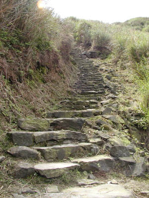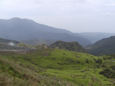 三月初春,屬於春暖花開的季節,但偶爾還是有一絲絲的寒風吹來,但並不冷,反而讓人感覺到那短暫的沁涼。上午十二時,我們一行七人騎著機車來到陽明山擎天崗,在遊客中心旁的販買部做好簡單的飲水食物補給之後,便朝著山上出發。金包里古道,早期是指金山(金山鄉的舊稱為金包里社)到士林的這一段路,因為先民夜挑漁獲沿著磺溪上溯,翻越擎天崗,經山仔后,清晨抵達士林、大稻程一帶販賣,因此又名「魚路古道」。這次我們則準備從擎天崗走到上磺溪。一路都是屬於下坡路段,雖然比較不耗費體力不過卻是苦了鞋子跟膝蓋。首先看到大油坑,不斷冉冉上昇的硫磺氣,在遠遠的山凹處形成壯麗的景觀。