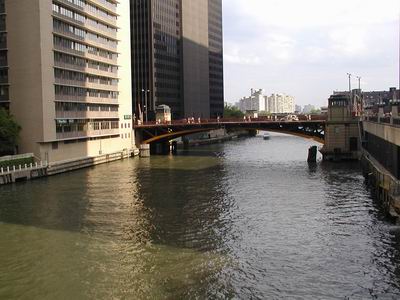 ↑芝加哥河,20世紀初期為解決飲水問題所鑿的運河,河上的橋是可以向兩邊開啟以利大船通過