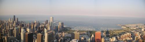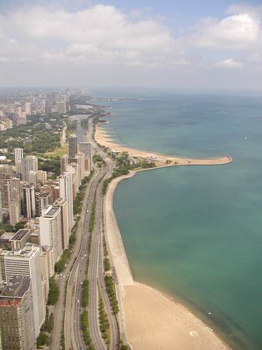 觀完全不加以雕飾,利用簡單的幾何圖形來達成一種建築之美,換句話說簡單的線條與外觀就是現代主義建築所崇尚的精神,紐約、芝加哥的很多摩天大樓都是後現代主義風格的作品,例如已經毀掉的世貿雙子星大樓直挺挺的兩棟建築便是最佳典範 。前一陣子曾看到台灣台北金融中心101大樓的消息,好像是今年年底購物中心就會啟用,2004年全部完工,屆時樓高504公尺的Taipei 101將會成為世界第一高的建築物,但世界第一高的頭銜似乎難以長久,很快地就會被上海金融中心與重建後的紐約世貿大樓取代了,而且聽說芝加哥已經開始籌畫蓋一棟超過600公尺的大樓,所以去爭這種世界第一高的頭銜似乎都只是短暫的虛名,不大有意義,況且摩天大樓的維護費用相當驚人,一天都以上百萬元來計算的,似乎已經失去以高度換取用地的意義了。搭乘高速電梯往一百零三層去,電梯速度很快,只要七十秒就到了,因為是傍晚時刻,除了西邊因為太陽西照的關係看不大清楚之外,往北邊看可以看到一排排超高大樓櫛比鱗次,往南看去則是比較沒有高的建築物,但可以看到位在湖畔的天文台以及水族館,以及一座超大的美式足球場。往東看去便是密西根湖,一個遼闊無比、一望無際的湖,乍看之下真的會以為是海。湖岸邊有幾個遊艇港,數以千計白色的遊艇與帆船停泊著,遠處的湖裡也有不少的船,能玩這種船的人一定是有錢人,數以千萬元的船以及港口停泊會費,而且重點是還得有閒、有時間去玩才行。晚上九點之後的街上就顯得沒什麼人潮了,一路走回位在附近的旅館休息了。