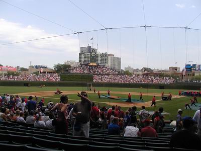一出站便看到里格利球場,雖然離開賽時間還有兩個小時,但球場附近已是人山人海,但Jay此時突然覺得肚子不舒服,於是他就自行搭車回飯店休息,我自己買了票進去看,都已經來到大聯盟的門口了我是沒有放棄不看的道理。買了內野本壘區後方第一層的位置,除了曬不到太陽之外,也看得十分清楚,但門票代價是四十元美金。里格利球場是一座位在市區的古老球場,興建於1914年,一直維持的天然草皮的傳統(似乎是目前唯一沒有使用人工草皮的MLB球場),而且東面外野區只有一層看台,因此可以看到有些住戶把頂樓改成包廂座位,收取門票讓人家上去看球賽,哈!也許新竹棒球場附近的居民可以考慮這樣做,但前提是職棒得場場客滿才行。每一個座位區的票價都是不同的,因此如果你買了別區較便宜的票是不能跑去較貴的地方坐的,因為每一區都會有一個工作人員在看守著。二點半開
