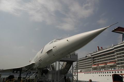 吃過飯之後,搭藍線地鐵到42街,準備去位在港口的一個博物館參觀。但是甲斯騰跟愛麗斯沒有興趣就先轉往第五大道逛街我跟威力兩人買了票進去了,進去之前還要經過安檢,因為老美太討人厭了,太多恐怖份子想拿炸彈炸他們。這個博物館本身就是二戰時期已經除役的奮進號航空母艦,上頭有很多飛機跟美國軍史可以參觀,航空母艦裡面真是大啊!簡直就是一個小城鎮。另外還有一台協和式客機,可以登機參觀裡面的情形,協和式客機是世界上唯一超音速的噴射客機,但目前因為虧損太多已經停止營運了。協和式客機的客艙很窄,座位大小就跟一般747的經濟艙差不多,一點也沒有豪華的感覺,要是我寧可選擇搭可以有大座位的商務艙也不要花這麼多錢來受罪啊!也難怪這飛機到最後會乏人問津淪落到停飛的命運。另外還有一艘潛水艇也是可以進去參觀,潛艇兵真的好可憐,平常就生活在那麼狹窄的空間裡,連睡覺都得縮在一個小小的空間裡,要翻身好像也不大行,真慘!