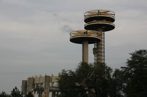 看看時間還早,想說再去中央公園走走,沒想到卻搭錯地鐵,又搭回皇后區去了。算了!將錯就錯,既然來到這,就換紫線到法拉盛看看吧,聽說那裡還有另一個中國城,有人叫他小台北。法拉盛是紫7的最後一站,出了站就是Main Street鬧區,果然到處都是中文招牌商店,這裡感覺比曼哈頓的中國城乾淨多了,吃的東西也不少。搭地鐵回去前一站,那裡是一個運動公園,美國公開賽就是在那舉行,而紐約大都會的主場也在那裡。聽說2012年奧運將要在紐約舉辦,屆時這裡將會有不少的運動項目在這舉行。坐在公園的長椅上把中午在中國城買的麵包拿出來吃了,嗯!還真悠閒,其實向這種隨性的自助旅行,中餐就可以省下來,在公園裡吃個麵包點心什麼的,既省錢又方便啊!之後在公園走啊走的,忽然就發現一個十分眼熟的東西,嗯!就是MIB第一集裡最後的場景嘛!不過看了那兩座塔之後才發現電影真的都是在亂掰,那塔的鐵梯間格足足超過六呎,威爾史密斯怎麼可能爬得上去啊!