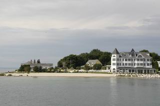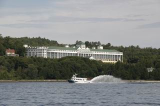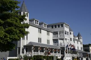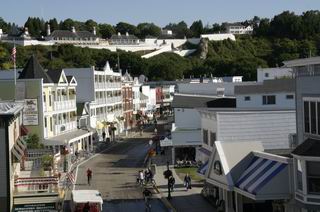 夏度假勝地。他的特色是島上只有馬車跟腳踏車,沒有任何的汽車,因此島上的環島公路就成為世界上唯一沒有汽車行駛的公路,除此之外還有密西根州第一座成立的州立公園。我們把車子停在渡船口的停車場,整理了一些簡單的行李之後便去等渡輪,從St. Ignace搭乘渡輪過去,約莫20分鐘的時間就到了Mackinac Island,船一駛進港口就看到一棟棟如童話般的房子,大多數都是旅館,有的則是私人住宅,但也可以出租,只是價錢都不怎麼便宜就是(聽說好像一個人要70元)。先到下榻的Lake View Hotel去check in,櫃臺是一個講話有法國腔的女黑人服務生,因為這裡已經相當靠近加拿大的法語區了,嘰哩咕嚕講了一堆,不理她趕快進房間休息。Lake View Hotel是一家位在港口旁邊Main Street的四星旅館,聽說有一百年的歷史,但因為其間仍不斷地在作整修,裡邊還是相當的舒適。中庭採用挑空的設計,從每一層樓的走廊上就可以看到一樓的游泳池,在裡頭嬉戲的小朋友們很吵。