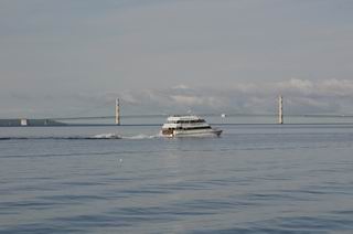 今日一大早便出發,因為要直接趕到北密的Mackinac Island,車程約五個半小時。沿著75號州際公路直往北行,越走車子是越少,氣溫也明顯感覺到降低許多。途經一個Outlet進去逛了逛,本想到時會太冷買件外套以防萬一,但那邊的貨色實在都很鳥,於是作罷,可能這個鄉下地方人們都比較不注重穿著吧?穿得舒服就好了,樣式就不是那麼重要。繼續趕路,總算在兩點到達了兩個半島的交界處,由一座相當巨大的雙懸吊橋Mackinaw大橋連接著,還要收過路費5元,這座橋遠遠看去實在是相當的壯觀,也難怪被譽為是密西根的景觀代表之一了,密西根州的駕照跟身份證背景就是這座橋,還有很多人的車牌都是選這個背景(美國的車牌可以自己選背景,但要加錢,政府真是會開發財源)。