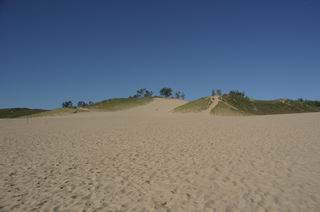 今日目的地「睡熊沙丘國家公園」(Sleeping Bear Dunes National Lakeshore),之前就常聽老師說這是一個密西根最美麗的國家公園,所以在這一次的旅行中當然不能錯過。從Traverse City到睡熊國家公園開車約半個小時,十分的近,但是公園的占地實在是太大了,一時也不知道要先去哪裡。開著車晃呀晃的,忽然發現左手邊出現了好大的一座沙丘,於是便進去一探究竟。原本以為了不起他就是一座小沙丘,沒想到走了一層還有一層,天啊!走到腳快斷掉,天氣又十分炎熱乾燥,只好返回,如果一直往前走應該會看到密