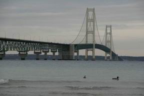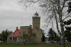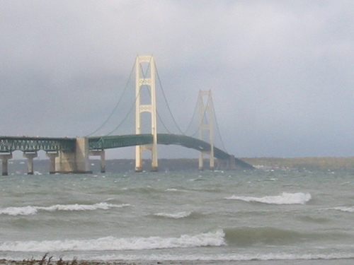 往上走有一個 scenes platform,可以往遠處望去整遍一望無際的楓樹林,可惜的是我們來得太晚,楓樹葉已經掉光了,只剩下一群光禿禿的樹幹矗立在風中。約四小時的車行時間,來到了Mackinaw City,找到餐廳解決了民生需求,順便晃去遊客中心拿了一些資料,我的老天爺,大部分的景點都在上個月就關閉了,搞什摸鳥飛機,看來只剩下自然公園可以去了。之後來到橋下,上半島與下半島之間最狹窄的地方,這裡形成一座海峽 (Straits of Mackinac),東接密西根湖,西臨休倫湖,兩個半島之間的交通就是鼎鼎大名的Mackinac Bridge,總長五英哩,目前排名世界第三的懸吊橋,當地人對它親暱為Mighty Mac,同時也是密西根州的特色標誌之一。旁邊有個燈塔,很像童話故事裡的建物物,相當可愛。
