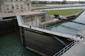 離開了Mackinaw City,繼續沿著75走到底,在美國與加拿大的邊界之間有一個城市叫Sault Ste. Marie,一看名字就知道是法國人取的名字,這個城市被蘇必略湖與休倫湖之間的St. Marys River切成兩部分,一半在美國,另一半則是在加拿大境內,兩國之間跟Detroit與Windsor一樣以大橋相互連接。來到一個叫做Soo Locks的地方, Locks有水閘、運河的意思,因為蘇必略湖的水位比休倫湖高出許多,因此連接兩湖的St. Marys River水流十分湍急,船隻在這裡無法通行,從前印地安人都是把獨木舟扛起來上岸步行通過這一段路。18世紀末,有個法國商人建造了第一座水閘,歷經兩百多年來的整修、重建,於是變成了現今的風貌。觀光客來到這,多會參加Soo Locks Boat Tour的行程,小型觀光船會帶你經過水閘,待兩邊閘門關起,水底另一端的活門打開,水位會上升將近兩層樓高 ,直到與蘇必略湖的水位同高,若是從蘇必略湖回休倫湖的話則是下降。不過現在已不是觀光季節,當然也就沒有船可以搭了,可恨,明年夏天鐵定再來一趟。運河旁有座公園,可以在裡頭散散步、觀看運河的船隻如何通過,還蠻悠閒自在的。