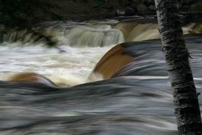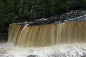 通過了Paradise這個小鎮,來到此行的最主要的目的地「Tahquamenon Falls」,這個瀑布分成上下兩個部分,下瀑布比較小,但有一個小湖泊,在夏天時可以在上面划船。有條通往瀑布的棧道,沿著走去約半哩路就可以到達瀑布旁,滂湃的水流聲勢十分的驚人,濺起的水花還一度讓我猶豫要把300D給收起來。接著再來到上瀑布,這個瀑布的水位落差比較大,但比較不能夠靠近,只能在遠處的觀景平台上遠眺。此時突然下起一陣大風雪,步行在樹林裡,同時被雪給迎面撲來的感覺真是特殊啊。遊客中心那邊有個叫做Legendary Tahquamenon Falls Brewery & Pub的餐廳,聽說裡邊的食物還頗具特色,為此昨天晚上我還特地上網查了一下,網頁上寫說全年無休,沒想到今天卻看到他掛出關閉的牌子,走近一看原來是從上個禮拜開始休息到十二月初,天啊!怎麼會這麼倒楣。只後忍著肚子餓,開到一個鎮上去吃了。在那個鎮上吃麥當勞的時候,外邊的風雪越下越誇張,打電話回去問同學,他們卻說底特律是大晴天,喔!沒想到光是密西根南北的天氣也可以差異如此之大。