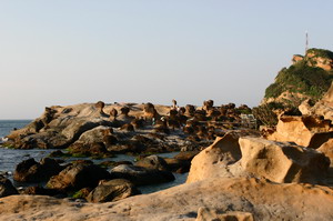今天的天氣實在很熱,走在大部分是戶外展場的朱銘美術館有點讓人無法消受。隨便逛一逛就跑了,到野柳地質公園去晃一晃,裡面的奇石很多好像已經被偷走,只剩下一個解說牌卻不見奇石蹤跡,真的很怪,女王頭也好像快要掉下來了,真慘喔!