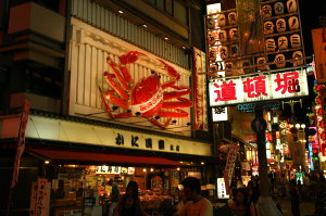 離開書寫山,搭車回到大阪市區,接著前往道頓崛去吃晚餐。逛了老半天,覺得每一家餐廳都很好吃,真是難以抉擇。最後決定去吃外邊有隻大螃蟹的那家。那是家螃蟹大餐專賣店,我們點了兩份定食,花了近¥10000,幾乎每一道菜都有螃蟹,那種似乎是日本的土產蟹,因為過去不曾在台灣吃過,嘿!吃得好過癮,但不知道會不會中風。吃完火鍋之後,最後有一道菜很奇怪,看著桌上擺的飯跟生蛋發呆,不知道要怎麼吃。服務生於是過來雞同鴨講一番,還是無法理解,她乾脆自己幫我們弄了,原來是要煮雜炊啊,哈哈,台灣來的土包子。