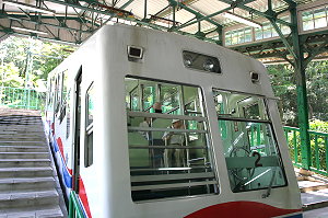 前往比叡山的交通有點複雜,先從大阪搭乘JR到達京都,換奈良線到JR東福寺車站,再換京阪線到出町柳車站,再轉搭叡山電鐵到八瀨比叡山口車站,最後再搭纜車上山。一堆路線轉車轉到七暈八素,到八瀨比叡山口車站要搭纜車時開始跟站務員雞同鴨講,最後他受不了,滴咕一陣便藉故要去開車跑了不理我。等我自己搞清楚要買什麼票之後,便再跑去向另一個站務員魯,終於是買到了票。因為上山的纜車分成兩段,第一段是CABLE CAR,類似香港太平山的那種纜車,之後得再換小空中纜車到達山頂。搭乘這種CABLE CAR十分有趣,車子在陡峻的山坡上行走,往旁邊一看便是斷谷懸崖,非常壯觀。