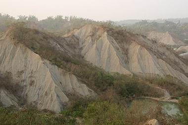 ↑高雄縣田寮鄉有一整座的惡地形山,其上吋草不生,不時來還會有泥火山噴出,是遠古時代造山運動的最佳教材。