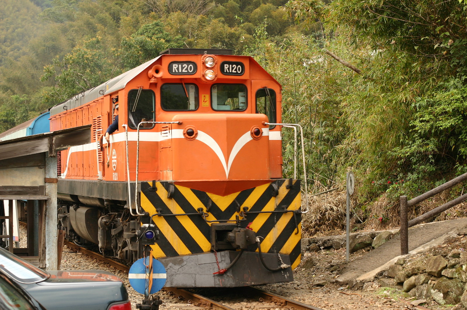 內灣線原本因為載客量逐年下滑而讓鐵路局考慮收掉這一條路線,但在地方之士的努力籌畫,將人文風情與原有的優美景致相互結合,再加上週休二日旅遊風日漸興盛,讓內灣線起死回生,假日的時候甚至要加開班次才能抒解摩肩擦踵的旅客。照片中的火車是正開進內灣站的,注意到駕駛員預備將一個鐵環丟出,表示該列車已行駛過此站了,而這種投火車信號環的動作幾乎已經很少見到了。