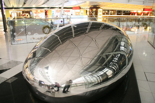 中午12點一到,便偷偷地離開座位逃離公司,深怕會再被捉回去到時趕不上飛機就慘了。一點半預約的計程車來載我們,開始有史以來最長的十七天旅行。先飛往香港赤臘角機場轉機,得在香港機場等三個小時,還好那裡的商店與餐廳相當多,買完一些東西之後,便去吃一碗拉麵填飽肚子。在餐廳附近還看到一個類似芝加哥千禧公園裡的金屬蛋型藝術品,頗有抄襲之嫌。等到時間到後,搭上飛往繼續飛往奧克蘭,飛機上的十一個小時還真是難熬。