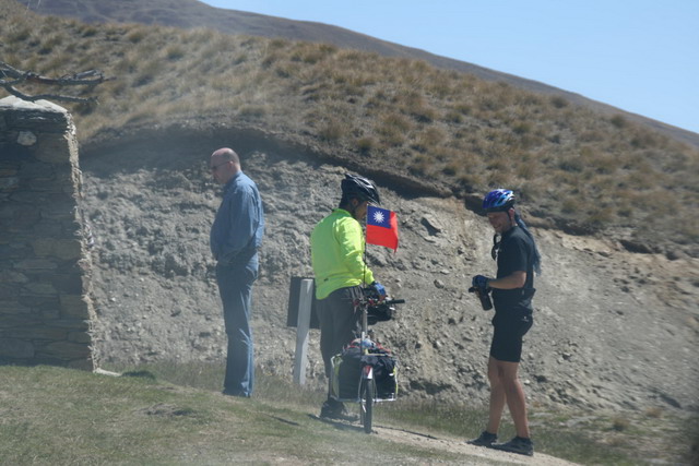 ▲有位同胞騎著腳踏車環島,後面還有國旗哩