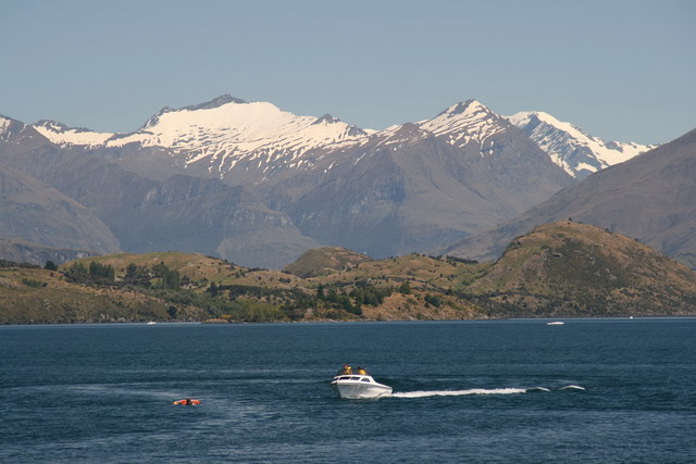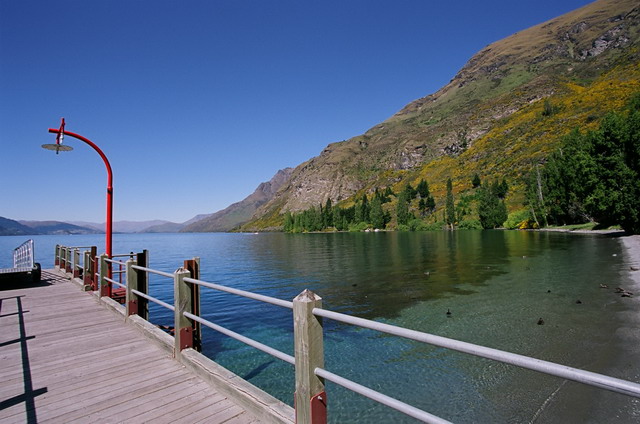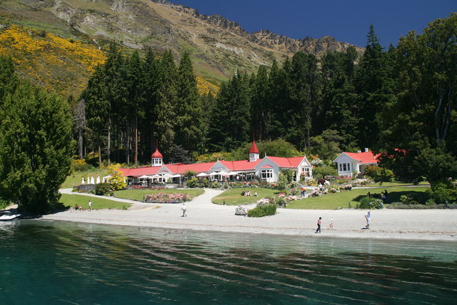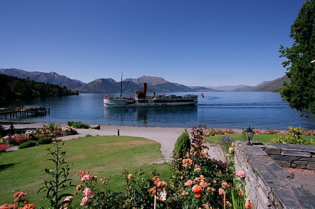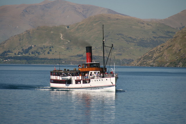 到達皇后鎮時已是快一點了,先找到下榻的RYDGES,不過櫃臺說要等到二點房間才能整理好,所以就先去搭TSS厄恩斯勞蒸汽船前往瓦爾特峰高原牧場。看了地圖,發現Real Journeys的遊客服務中心就在旅館的不遠處,於是便步行過去,市區實在很難停車。上船前先啃了一份外帶的壽司, 雖然船上也有販賣食物不過總是薯條、三明治那些吃不慣的東西,唯一想喝的啤酒又不能買(行為禁止),只好沿途猛拍照轉移注意力。