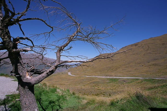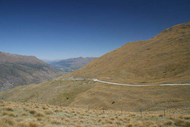 加完油,選擇走較小條但較近的86號道路,這條道路會穿越高山,冬天下大雪時會封閉,植被景觀像極了上合歡山武嶺那一段公路。到達最高點時還可以遠眺皇后鎮以及整個群山峻嶺,相當美麗。