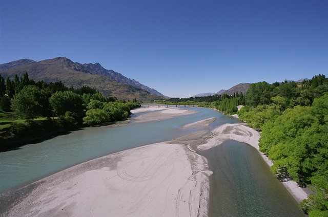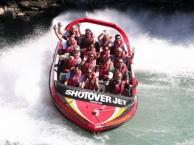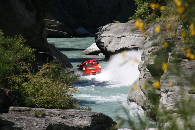 下午想要繼續找高空彈跳的發源地卡瓦勞何橋卻還是找不到,最後只好先去參加噴射飛船的活動了。噴射飛船是利用將大量吸入的水噴射出去所產生的強大動力而前進,速度可達到八十公里,可高速航行在淺灘、激流之上。依照旅遊指南的指示坐在駕駛後面的位置,以避免被水濺濕。駕駛員將噴射飛船來回地在Shoter河流上上快速穿梭著,每次在快碰到岩壁、淺灘時都千鈞一髮地閃過,偶爾還來個360大甩尾,身上會被飛濺起來的河水給打濕,不過我們坐的這個位置果真比較不濕,哈。