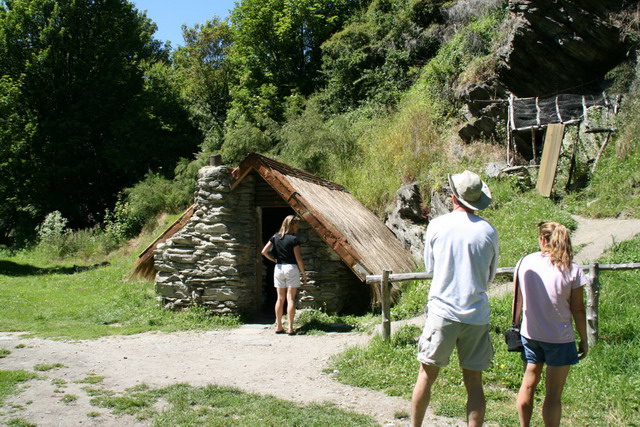 早上本來想去飯店吃早餐(房價未含早餐),最後還是決定去麥當勞解決~最便宜快速的外食方式。前往位在皇后鎮16公里處的箭城,這在十九世紀時是一處淘金小鎮,鎮上有一條老街,跟絕大多數的history area一樣有著許多的舊房子所改建的紀念品商店、博物館。另外在河谷地上,則可以看到當年華人來這淘金的歷史遺跡,住的是小小的簡陋石屋,甚至有在山坡上隨便搭建個遮風避雨的地方就住了,吃的是自己種植的野菜,生活圈完全被隔離在白人之外,對照於上面的老街,真是天壤之別。看在那些外國觀光客的眼裡也許只會覺得中國人怎麼可以這麼隨便生活,但看在我們的眼裡,豈止是刻苦耐勞可以形容而已,那是一種離家背景、不得不已的血淚辛酸啊!