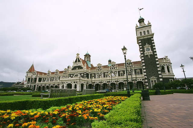 遺憾的是,今天持續陰天,無法拍到每個攝影人都要有一張的但尼丁火車站照片,天空灰濛濛的顏色真令人沮喪。但尼丁火車站的外觀真是特別,宛如童話故事裡的貴族城堡一般。在這裡還可以搭峽谷鐵路火車遊覽,一天有兩班,但來回要四個多小時,不夠時間去了,加上天氣又不好應該看不到什麼碗糕。