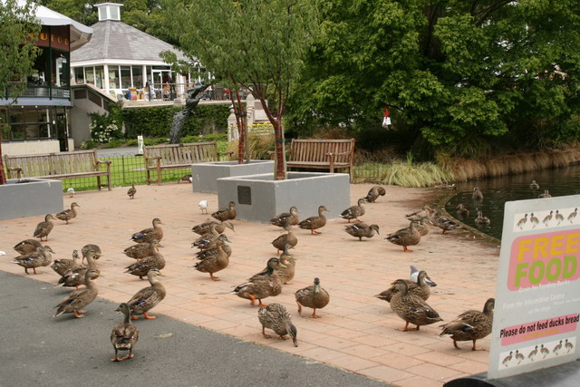 ▲池塘邊又是一堆鴨子,旁邊還給你弄了一個「免費食物」的牌子,難怪會鴨滿為患,還叫你不要餵麵包,怕他們落賽嗎?真挑食
