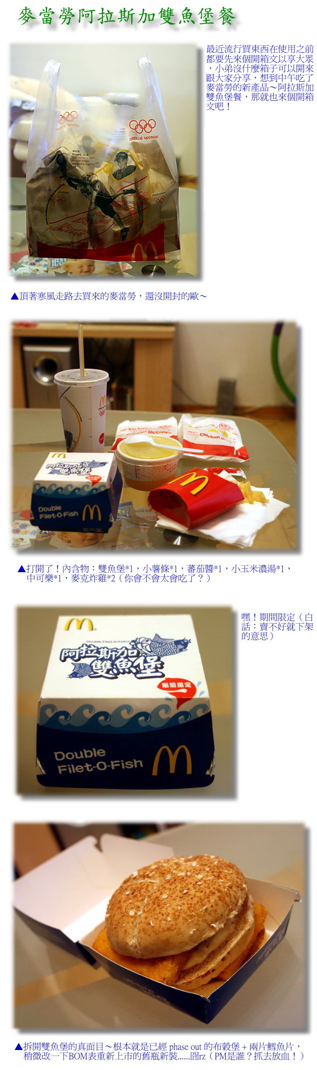 麥當勞雙魚堡閃亮開箱文 by 虎男 Posted on 2008 年 1 月 24 日2024 年 10 月 31 日版主:請給分!路人甲:有病!路人乙:版主瘋了。鄭宏疑:來,力紅粒供塊埋ㄟ!PTT鄉民甲:5F的有吃過!PTT鄉民乙:反串失敗!小惡魔:沒有看到箱子,零分。 文章閱讀: 163