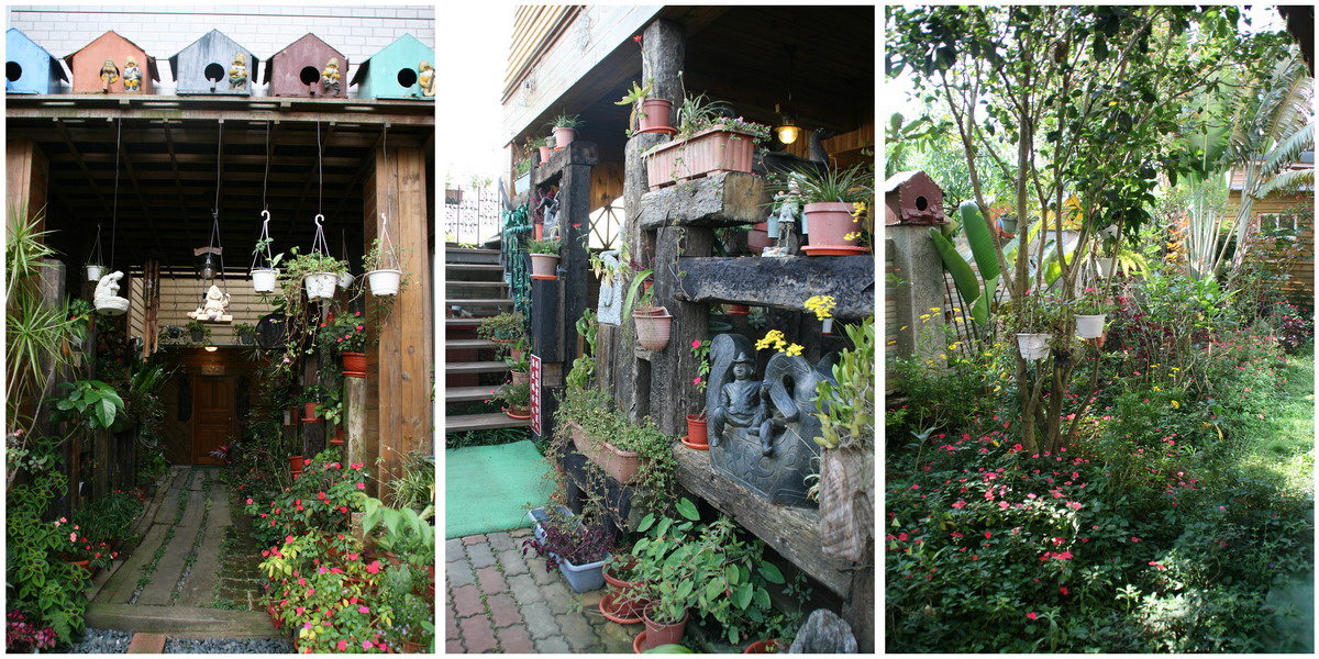 這一次來新社,終於找了家民宿待上一晚,想藉此體驗田園居的樂趣。選擇的是「花田民宿」,這是一家元老級的民宿了,老闆與老闆娘將原本是自家的庭院改成咖啡店,由於老闆娘曾在台中精明一街開過「花田Cafe」,因此除了民宿之外,簡餐、飲料這些東西自然而然地就成了這裡十分受歡迎的東西。後來新社地區觀光興起,於是便將兒子外出求學所空下的自家房間改裝成民宿,再加上另一棟新建的雙層木屋,便是有10間房間的花田民宿了。