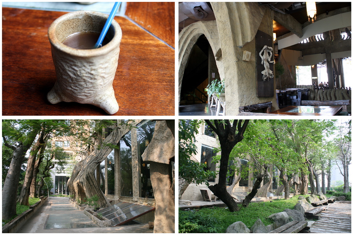 幾年前來台中經過市政路時,曾被一座巨大的怪異的建築物給吸引住,仔細一看發現他居然是座餐廳,一間叫做伍角船板的中式餐廳。店主謝麗香算是個傳奇女子,早年在海邊撿捨漂流木時,偶然看到嵌在漂流木上的伍角古錢幣,因此建築夢想一觸即發,源源不絕。店裡頭的建築及許多雕塑都出自她手,大大地顛覆一般傳統的設計觀感,別具特色。