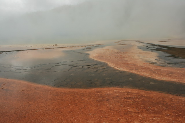 ↓↑ 中間歇泉盆地(Midway Geyser Basin),水中的水藻生物構成了多層的顏色