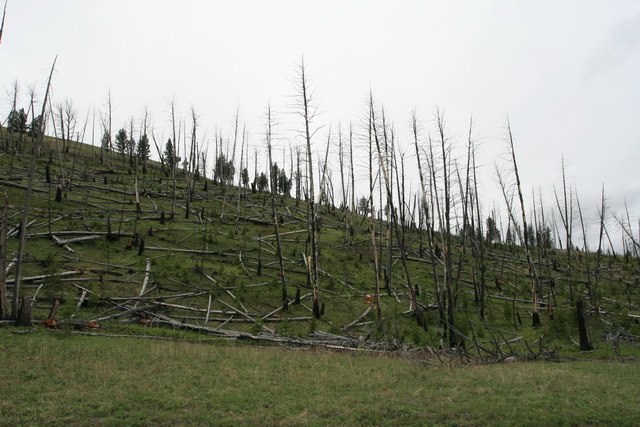 ↑ 1988年的世紀大火燒掉了黃石的大部分森林,公園管理當局的政策是這些枯木任其橫倒而不加以移除,後方可見新的樹林已長出來