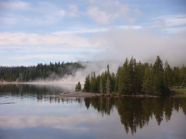 從西姆噴泉盆地望去就可以看到遼闊的黃石湖,這個區域在64萬年前曾經發生過驚天動地的火山爆發,後來留下來的巨大火山口陸續被冰河所擠壓,形成了現今的火口湖黃石湖,亦是美國最大的高山湖泊。湖光山色及豐富的野生動物,是此區的最大特色。不過老實說,這樣的湖光山色在其他的國家公園都可以輕易地找到,所以就不需在此停留過久了。