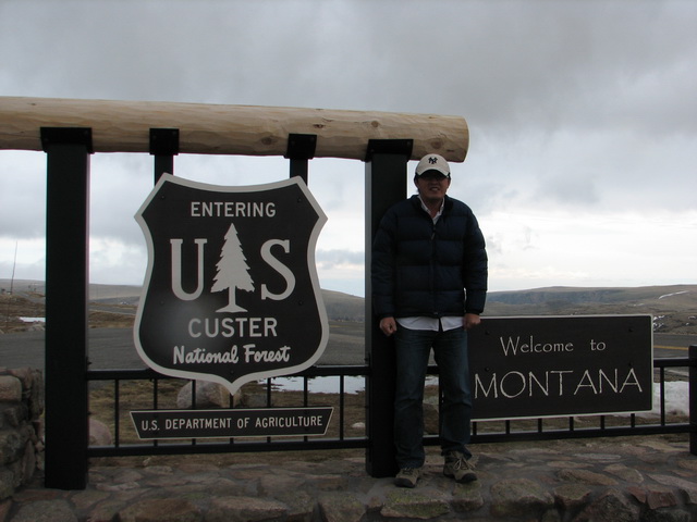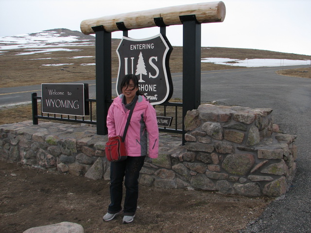 ↑ ↓ 在山上有一處便是蒙大拿與懷俄明的州界,一人一邊一州 (真的很冷,風又很強,站在外面根本無法撐太久,見鬼了,把我騙來這種地方)