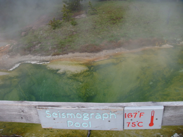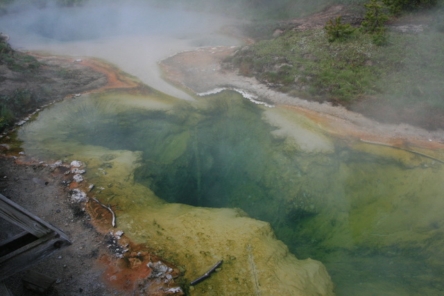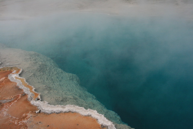 繼續黃石未完成的旅程。首先來到昨天尚未拜訪位於黃石湖邊的西姆噴泉盆地(West Thumb Geyser Basin),十五萬年前因地殼變動陷落而形成。這裡的「深淵池」(Abyss Pool)是黃石公園內最深的溫泉池,達16公尺深,從步道區探頭往下望,深不見底。這讓我想起了詹姆斯克麥隆的成名作:無底洞(The Abyss),真不知親身進入那些深淵洞裡會是什麼樣的恐懼感受。