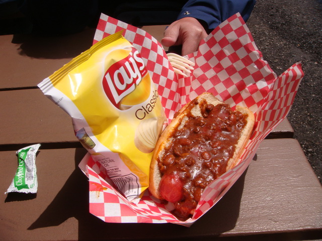 ↓ ↑ 中午就在這家商店休息、吃中餐,買的是chili dog,一種有加肉醬的熱狗,隨便啃一啃