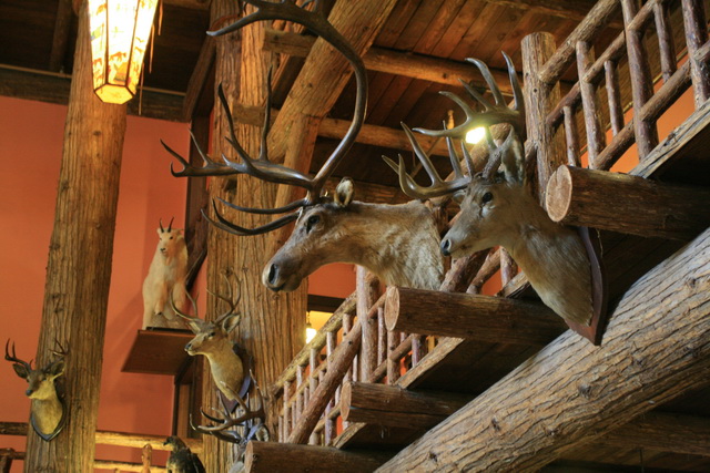 ↑ 旅館內掛的標本反映出美國人的狩獵文化,即便是現在,美國男子仍視打獵為男子氣概的象徵。而州政府也有相關嚴格的狩獵規定,包括狩獵地點、時間以及對象(幼小懷孕者禁止獵殺)。有些人會把所捕獲到的獵物頭砍下做成標本,掛在獵物展示間,電影「終極戰士」裡的Predator會把獵殺到的人類與異型頭骨,作風乾排列收藏,極為類似的野蠻炫耀行為