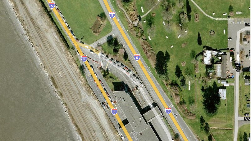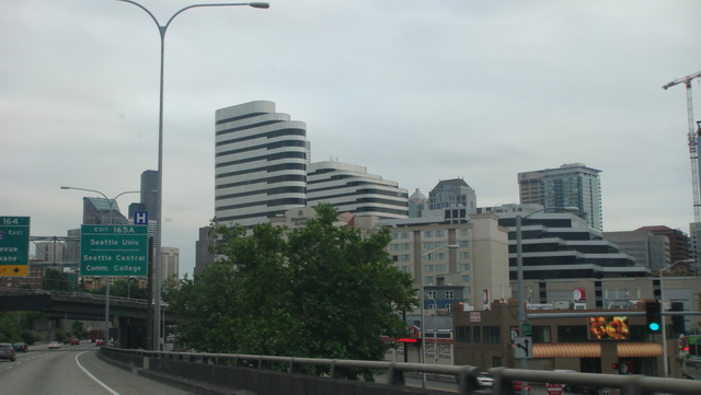 從溫哥華出發沿著洲際5號公路往南一路開就會到西雅圖,不過得先過美國海關。由於是短期內再次入境美國,已經有I-94的居留許可,不需要再去填入境的單子。不過沒想到我居然不小心開到最右邊那一條專供當地人使用的快速通關道(加拿大人很多都每天”出國”到美國上班),結果被抓進去詢問了一番才放我們走=.=