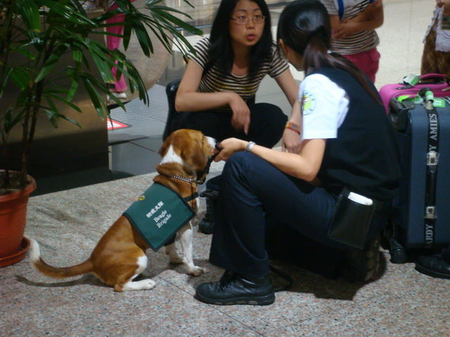 ↑ 入關了,凌晨五點,桃園機場農委會的防疫犬還在執勤,專門聞你的行李有沒有偷帶水果蔬菜,若他在你身邊坐下來,你就得打開行李接受檢查=.=