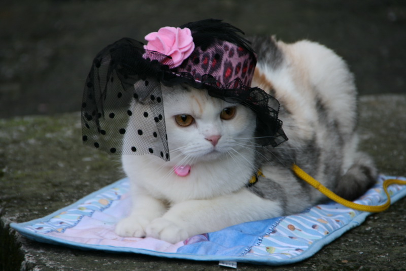 ↑ 這隻貓被主人打扮成這副德性,擺在一旁供人拍照,怪得是她居然不會想逃走,在那裡蹲了好久的時間