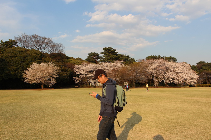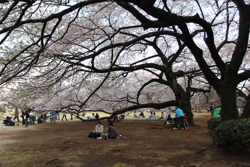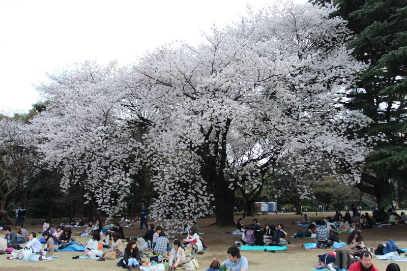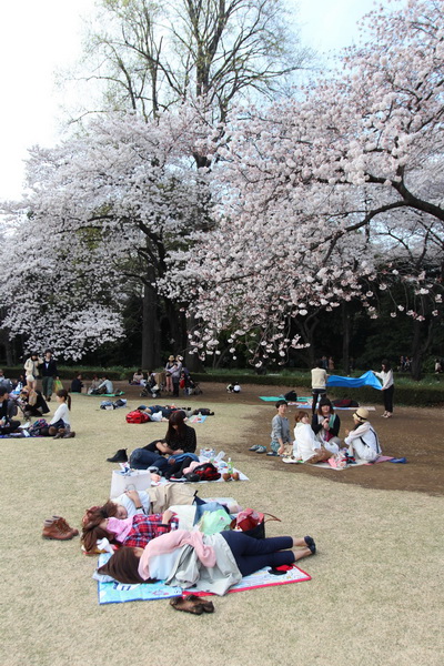 ↑↓ 櫻花季節來到新宿可以看到成群結伴的日本民眾,坐在繁花盛開的櫻樹下喝茶、吃便當、聊天或睡覺等