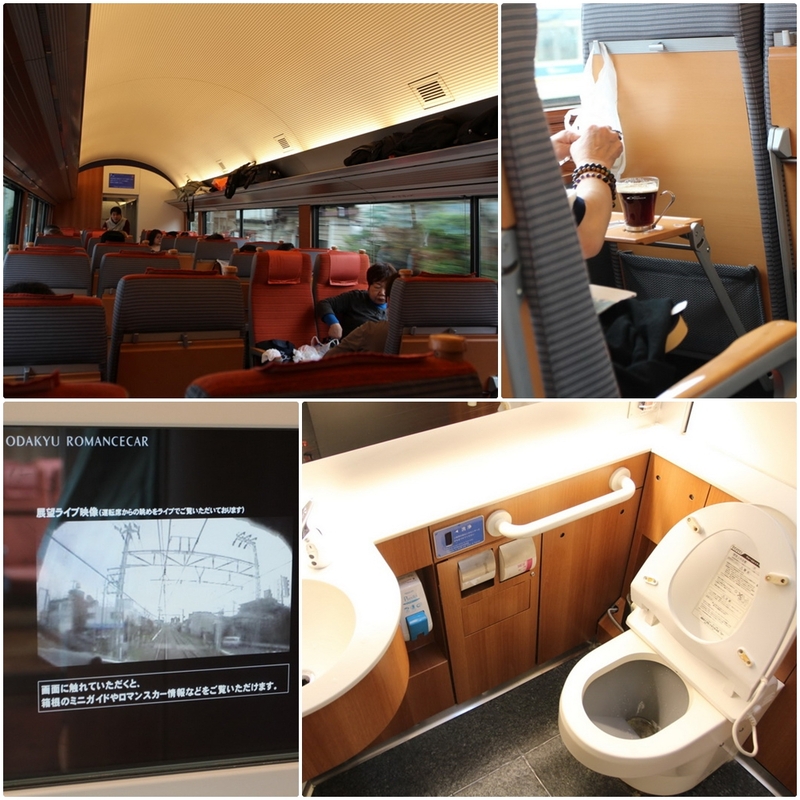 VSE車廂內十分新淨清潔,設施也十分完善,座位距離寬闊,連廁所都無比寬敞舒適,當然免治馬桶是必備(右下)。車廂內的燈光顏色與設備配色呈現十分柔和悅目的感覺。咖啡迷更不可錯過VSE列車此型號車限定的咖啡(右上),這杯熱咖啡特別的是除了是用精緻玻璃杯端上來之外,還是採用有機種植的咖啡新鮮烘焙研磨出來的,每杯¥330。邊欣賞窗外山田美景邊啜飲著如此香濃的咖啡,大概就是揭開箱根旅行第一幕的最佳方式。