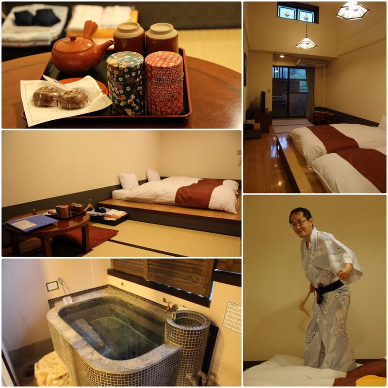 (左上)房間內附綠茶及烏龍茶,以及兩粒一之湯的小饅頭,不過小饅頭還是箱根湯本車站附近的「茶房菜の花」的黑糖饅頭與黑芝麻小饅頭最好吃,只可惜保存期限很短,不大容易帶回來跟大家分享。房間屬於日式風格,外面陽台上還有一個私人露天風呂(左下),大浴場沒開的時段就可以在這裡泡湯。