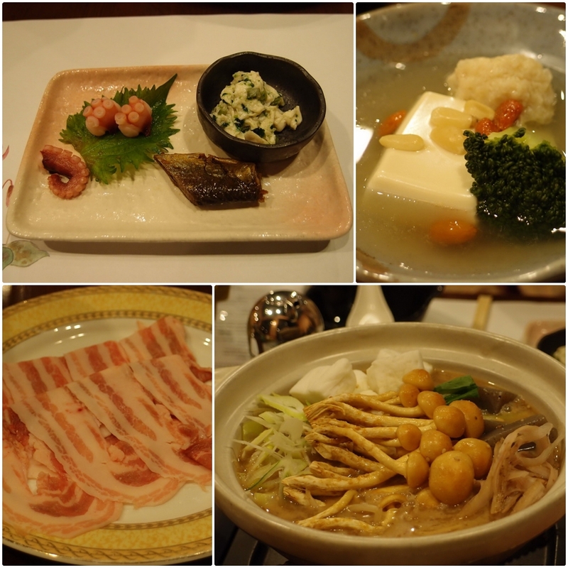 飽得要命的晚餐:訂房時可選擇晚上是否要在旅館內用餐,大致上以那個涮涮鍋為主(湯底好像有放味噌跟胡麻,好香),搭配一些醃物、豆腐(豆腐是箱根的名產,口感綿細、豆香滿溢,與台灣的豆腐有很大的不同)、炸物與烤物,那豬肉的油雪花很漂亮,口感非常細緻不油膩。
