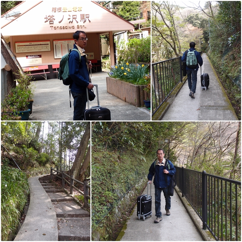 塔ノ沢是個無人車站,下車後車長會跑下來驗票,由此可見他的位置十分偏僻。出了車站之後沿著指標便可往旅館方向走,但當天因為下雨視線不良(一整個藉口),居然怎麼找都找不到,還跑到下面的一の湯本館問路,冏oz,不過也還好身上有帶iPhone 4S+3G網路,感覺不對了趕緊確認目前座標即時回頭,才不致於拉著行李在雨中宛如無頭蒼蠅一般。
