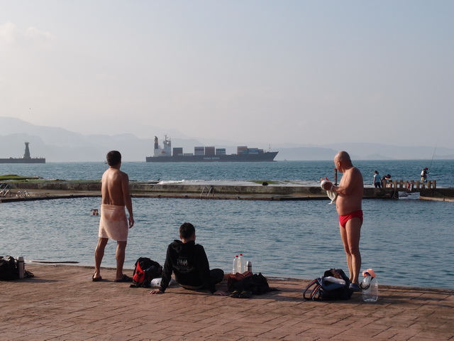 穿紅色小泳褲的光頭阿伯很搶鏡