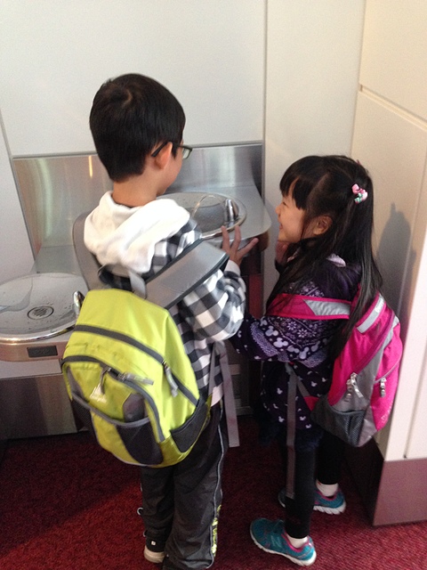 ↑ 小朋友出國什麼都感到新奇,連個飲水機也可以玩起來