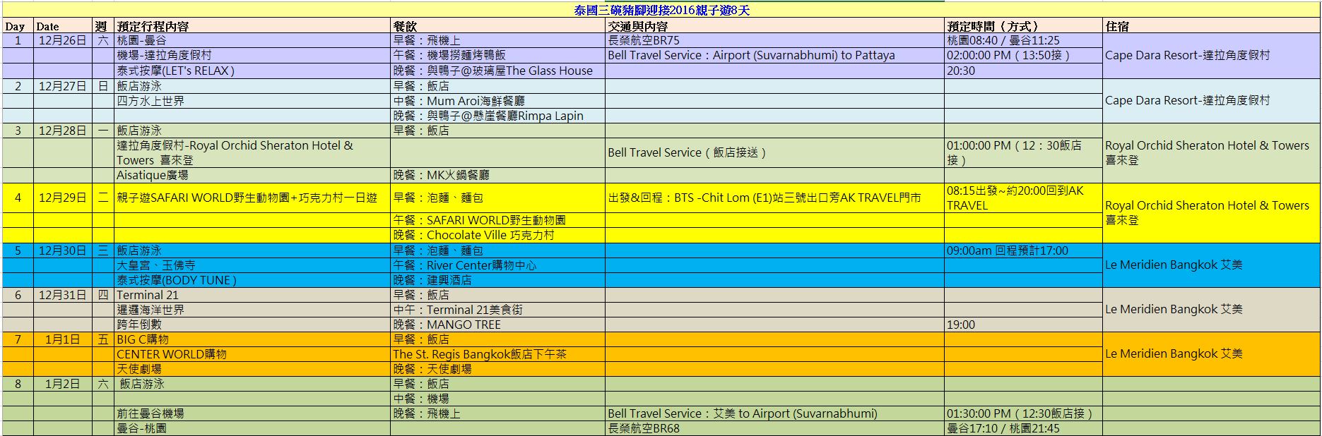 34度C的新年假期:泰國親子自由行DAY0【行程安排】 by 虎男 Posted on 2016 年 1 月 3 日2023 年 4 月 10 日 繼東京之後, 第二個親子自由行的國家是只有熱跟很熱兩種季節的泰國。 八天的行程排得很鬆, 捨棄了以往戰鬥營拼行程撈本的玩法, (團主帳號被盜?) 一天最多排兩個景點慢慢玩, 還有慢慢地在度假飯店享受游泳池, 真的是十分輕鬆愉快的假期。 特別感謝:小鴨,此次行程有你真好! 文章閱讀: 305