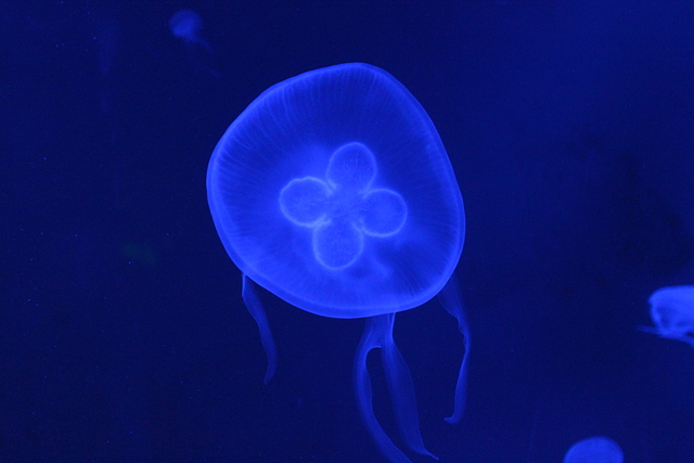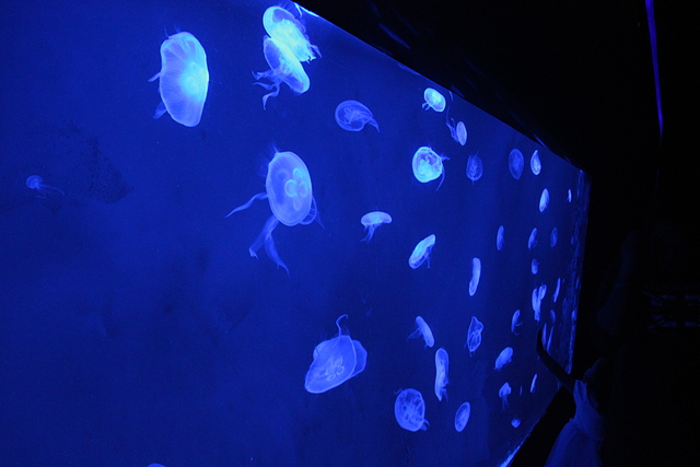 ↓↑ 被打了螢光的水母閃閃發亮,水母本身是不會發光的喔