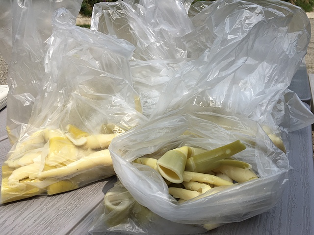 ↑↓ 廖媽媽帶我們去採桂竹筍,小朋友採得不亦樂乎。因為採下的竹筍不能放著會「出青」老化影響口感,所以廖媽媽還幫我們處理好燙熟,究感心